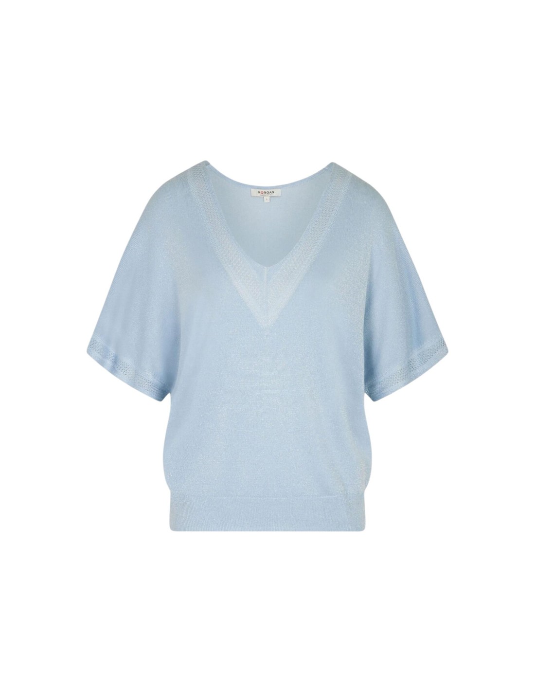 Pull bleu azur Morgan, lumineux et raffiné. Sa matière viscose‑métal apporte une touche brillante subtile.