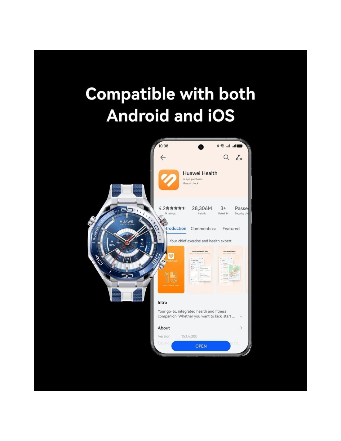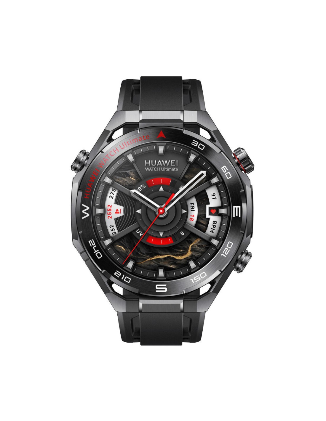 La smartwatch Huawei Watch Ultimate 2 est une montre connectée unisexe au design rond qui associe des matériaux résistants et confortables, avec un boîtier en acier inoxydable, des éléments en plastique et un bracelet en silicone ajustable avec boucle, dans une élégante couleur noire et en taille unique, adaptée à la plupart des poignets (env. 140 mm). Elle intègre un écran AMOLED de 1,5" dans un boîtier d’environ Ø 48 mm et des dimensions de 4,9 x 4,9 x 1,3 cm, offrant un affichage net et clair des données d’activité, notifications et mesures de santé. Son système d’exploitation RTOS est optimisé pour un fonctionnement fluide et économe en énergie, soutenu par une batterie lithium‑ion rechargeable offrant jusqu’à 14 jours d’autonomie selon l’usage, avec charge via prise EU et fonctionnement de type électrique. Côté capteurs, elle intègre un cardiofréquencemètre, un accéléromètre, un gyroscope, un baromètre et un capteur de luminosité ambiante, permettant un suivi détaillé de l’activité physique, le contrôle de la fréquence cardiaque et le réglage automatique de la luminosité de l’écran, ainsi que des données utiles pour les sports en extérieur. En connectivité, la montre dispose du Bluetooth 5.2, du Wi‑Fi, d’une compatibilité avec 4G / réseau électrique selon configuration, et des systèmes de positionnement GPS, Glonass, Galileo, BeiDou, offrant une localisation précise pour itinéraires, entraînements et usage avancé en plein air, avec navigation et marquage de points. Elle est compatible avec Android et iOS, ce qui permet de synchroniser notifications, appels et applications de base avec un large éventail de smartphones, et intègre le NFC pour des fonctions de connectivité à courte portée selon les services disponibles. Pour l’interaction, elle propose un microphone intégré et des haut‑parleurs intégrés, facilitant l’usage de l’assistant vocal et la gestion des appels au poignet, tandis que l’interface tactile et les commandes physiques permettent une utilisation simple dans différentes conditions. Elle offre une résistance à l’eau de 10 ATM, adaptée à une utilisation intensive en natation et aux sports aquatiques récréatifs, apportant une sécurité face aux immersions et aux éclaboussures au quotidien. Elle est fournie avec une guide d’installation incluse, ce qui simplifie la première configuration et l’appairage avec le mobile. Dans l’ensemble, la Huawei Watch Ultimate 2 se présente comme une montre connectée avancée et complète, destinée aux utilisateurs cherchant un appareil robuste pour le sport, la vie quotidienne et une connectivité constante au poignet.