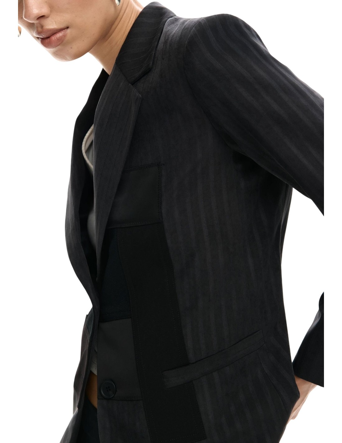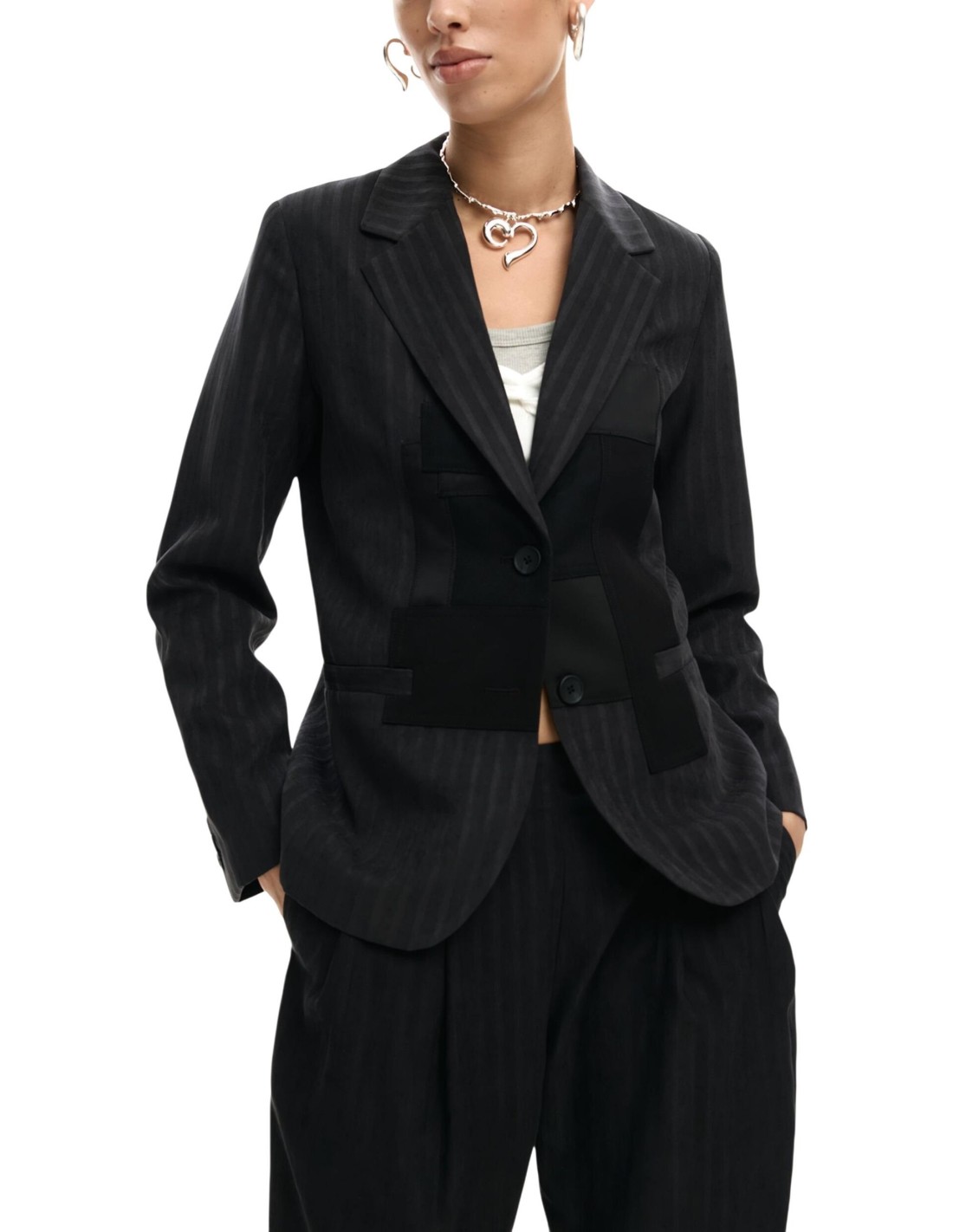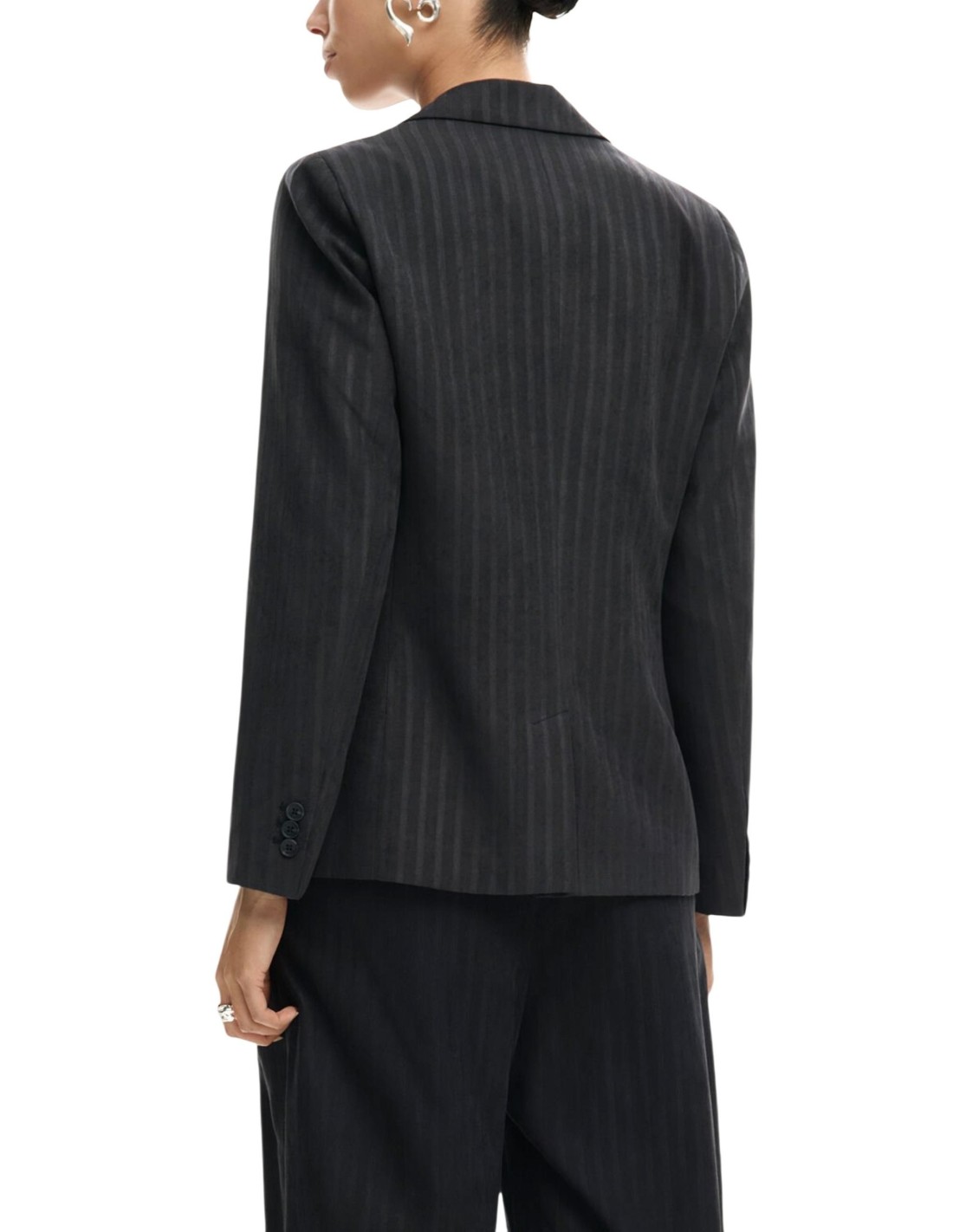 Veste grise Desigual, élégante et structurée. Ses fines rayures et son col revers créent un style raffiné.